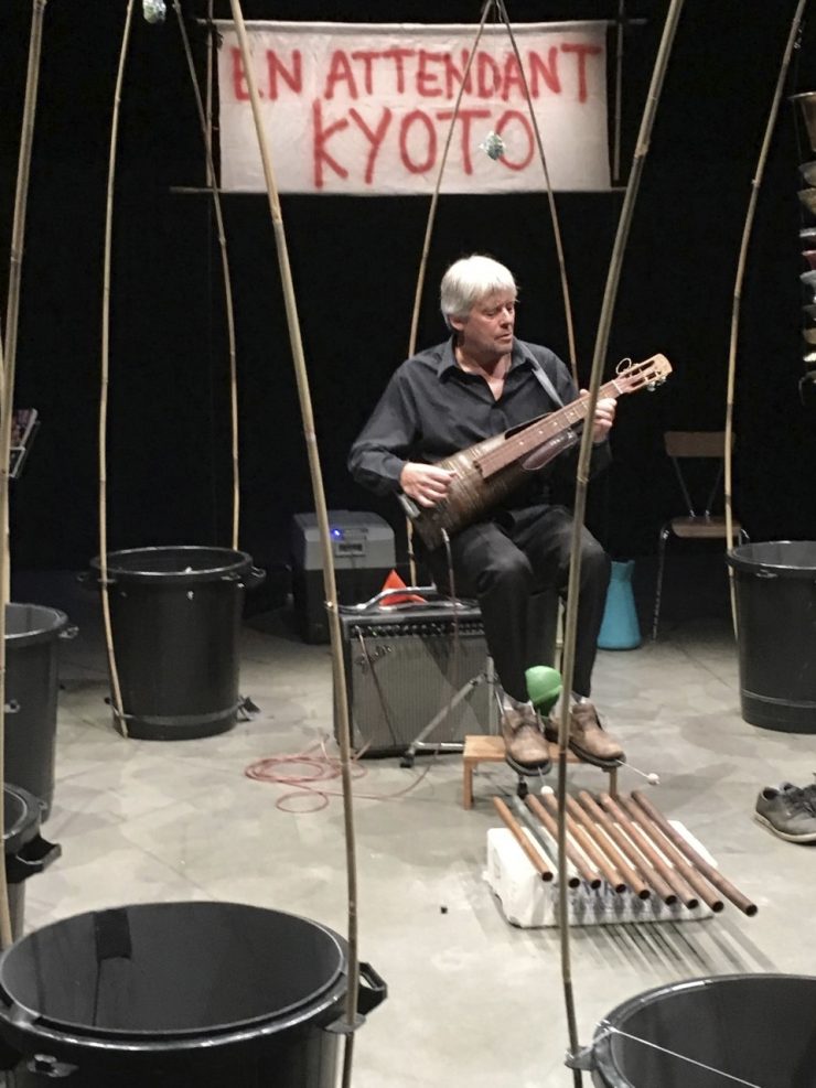 „Waiting for Kyoto“ ist eine musikalische Hommage an das Kyoto-Protokoll. Zwischen Plastikmüll, recycelten Musikinstrumenten und Glasmurmeln in Eiswürfeln entsteht eine dramatische Geräuschkulisse. Werden wir passiv auf den Untergang warten? Manche singen unter der Dusche, andere im Regen. Ein Orchester spielte Musik auf der sinkenden Titanic…