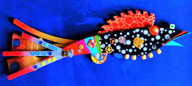 So erschafft Heinz Birnbaum aus Welkenraedt „mythische“ Wesen, die aus alten Staubsaugern, Toastern, Ferngläsern und anderen Fundstücken entstehen. Seine Figuren wirken lebendig, oft mit einem Augenzwinkern, und laden zum Schmunzeln ein. Erwin Radermacher aus Eupen, vielen eher durch seine dynamische Acrylmalerei bekannt, zeigt eine ganz andere Seite: Mit großer Präzision setzt er bunte Fische und Boote aus kleinsten Fundstücken zusammen und verleiht ihnen eine erstaunliche Detailtiefe.