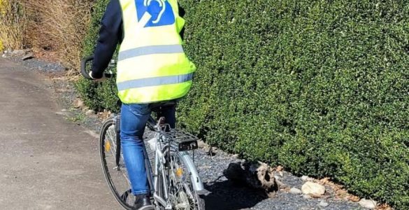 Fluo-Westen für schwerhörige Menschen Ostbelgien. – Ein schwerhöriger Spaziergänger erlebt eine gefährliche Situation, als ein Fahrradfahrer zu nahe vorbeifährt. Trotz des rechtzeitigen Klingelns des Radfahrers hört der...