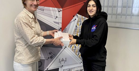 Lange Nacht der Technik RSI Eupen. – Am vergangenen Freitag hatte die Direktorin des RSI, Myriam Wolkener, die Freude, der 14-jährigen Ghena Azzi aus Kettenis das anlässlich des Preisausschreibens zur „Langen Nacht der...
