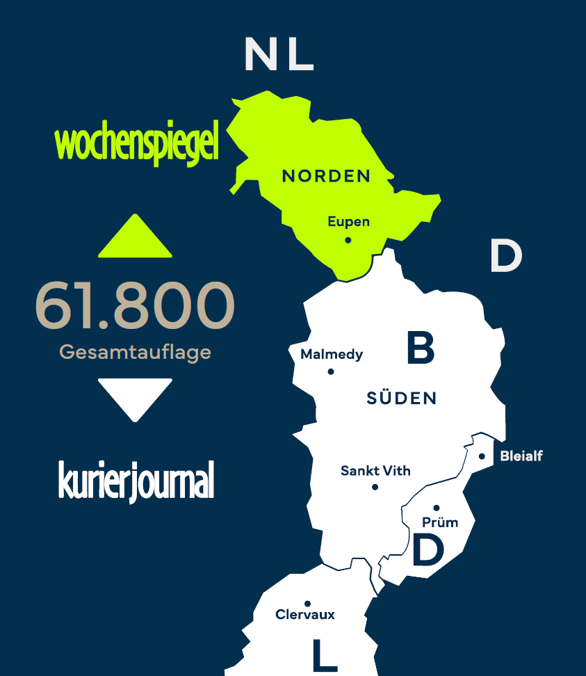 Erreichen Sie maximale Sichtbarkeit mit einer Zeitungsanzeige im Wochenspiegel und/oder im Kurier Journal. Gemeinsam erreichen beide Zeitungen eine Gesamtauflage von 61.800 Exemplaren und damit einen Großteil der ostbelgischen Bevölkerung.